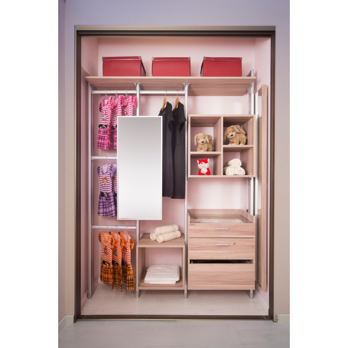This closet is no ordinary closet! With sliding doors that are made of whiteboard material and magnetic, your little one can express his or her creativity or even for reminders. The customizable closet design allows for the wardrobe to fit your needs. The full-length pull out a mirror and flip mirror allows you to save space. With additional features of a magnetic whiteboard on the wardrobe sliding door, to allow kids can do writing memos or even doing spelling homework on the closet door. The design saves a lot of space and gives you more space. The closet also gives you the needed storage for all your clothes and jewelry. You can customize the closet to your needs and save space.